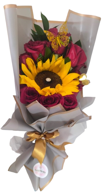Un ramo alegre y elegante que combina 12 rosas con un girasol central ,follajes y mariposa para dar volumen y un acabado fresco, envuelto en empaque premium. Perfecto para cumpleaños, felicitaciones, agradecimientos o para alegrarle el día a alguien especial.
