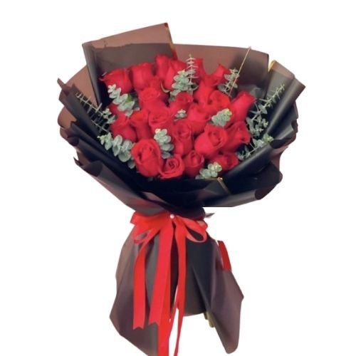 Ramo de 24 rosas rojas en presentación premium destaca por su envoltura negra elegante y lazo rojo, creando un contraste sofisticado y muy romántico. Incluye follaje para dar textura y frescura. Ideal para aniversarios, San Valentín, declaraciones de amor, cumpleaños o para decir “te amo” sin palabras.Domicilios en Medellin y Valle de Aburra.