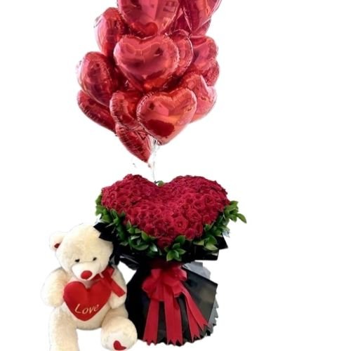 Caja Romántica: Corazón de Rosas Rojas + Oso + Dulces Surtidos