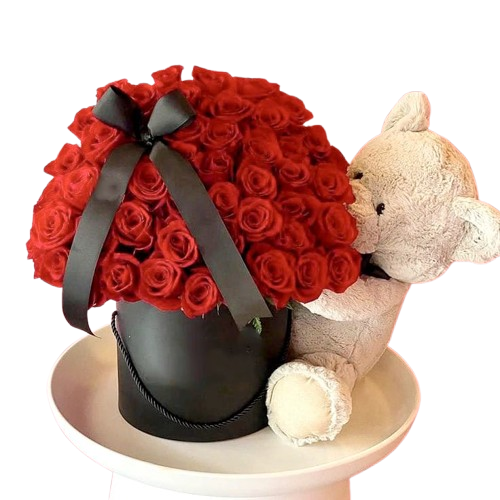 Caja Premium de 72 Rosas Rojas con Moño Negro y Osito