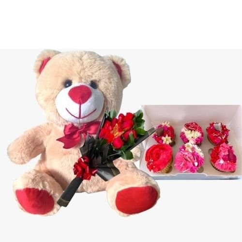 Combo Dulce Abrazo: Peluche 25 cm + 12 Rosas + 6 Cupcakes