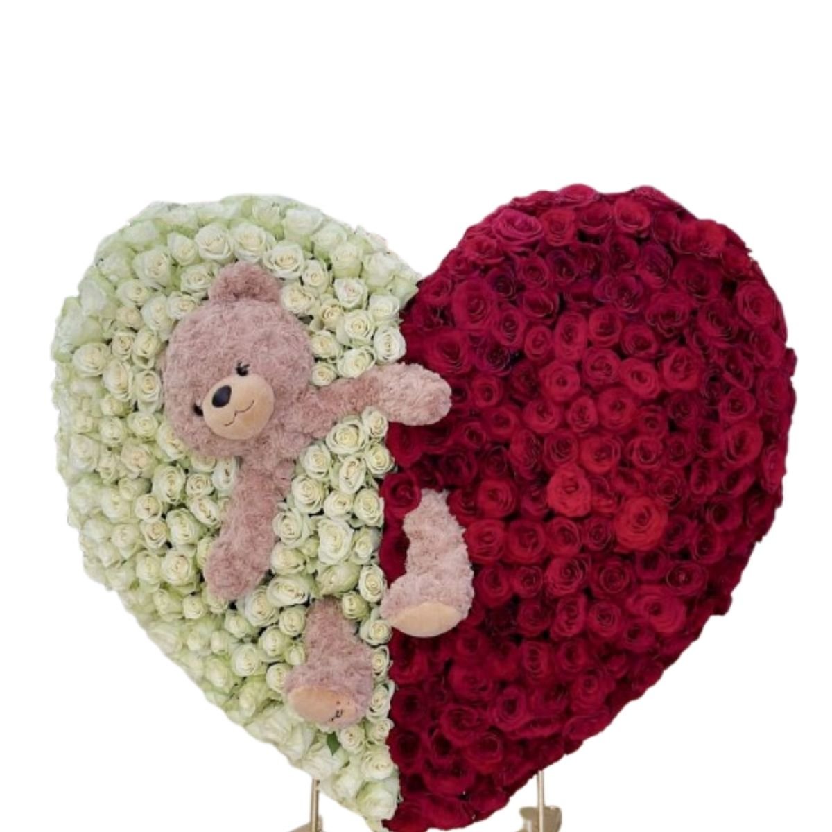 Un detalle romántico, tierno y de alto impacto, perfecto para sorprender en San Valentín o en una fecha especial. Este corazón bicolor combina 100 rosas blancas y 100 rosas rojas en un pedestal mediano. Diseño elegante, acompañado por un oso de peluche integrado que lo hace aún más especial y memorable. 💝 Ideal para San Valentín, aniversarios, cumpleaños, pedida de mano o una sorpresa inolvidable.